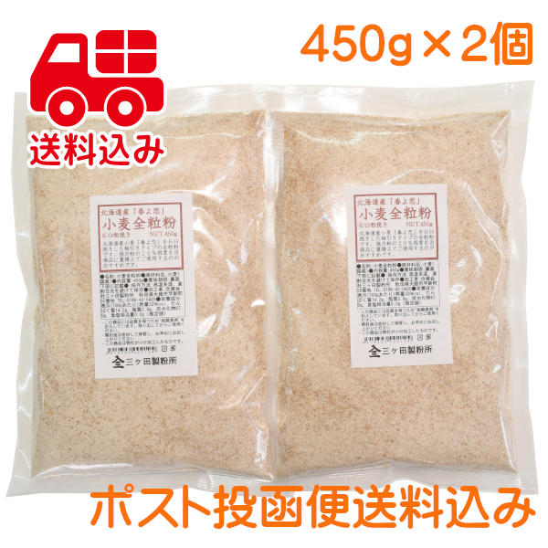 小麦全粒粉 900g(450g2個) 北海道産 春よ恋 粗引き 石臼挽き 国産 送料無料