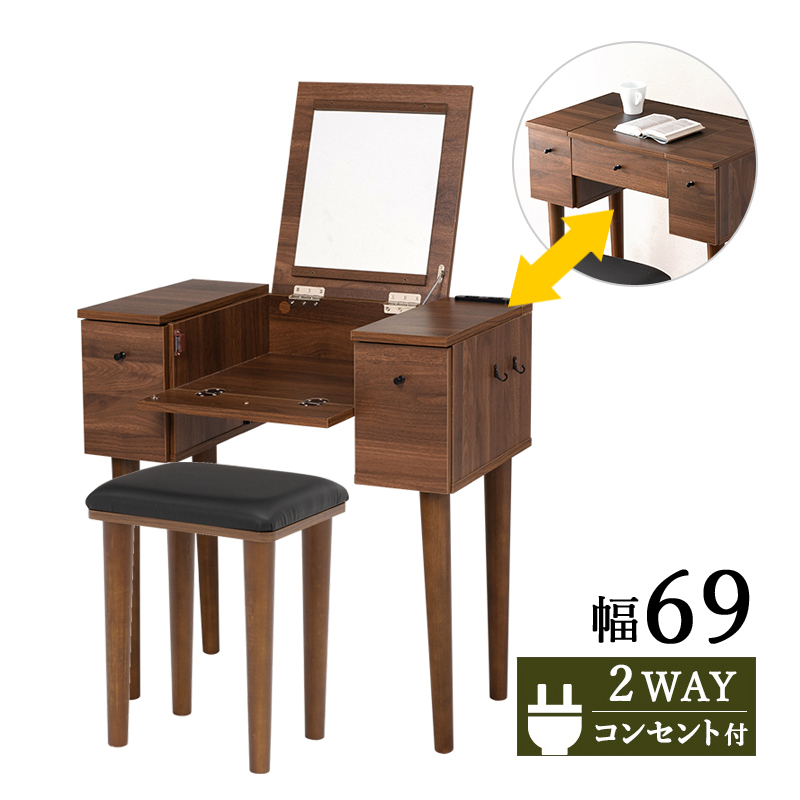 2WAY ドレッサー デスク スツール付 合成皮革 ミラー 角度調整 一面鏡 2口コンセント 化粧 PC ワーク 学習 メイク 道具 収納 フック付 ダークブラウン