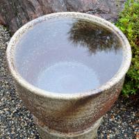 元来、神前、仏前で口をすすぎ、身を清めるための水を確保するための器をさす。庭先に備えた石や岩などをくりぬいた手水鉢のことです。現代では、蹲をそういったことのために設置している所をあまり見掛けなくなりました。現在、蹲は和風庭園を現すためのポイントになっています。また 水連、浮き草、メダカ、金魚などの鉢として使われています。