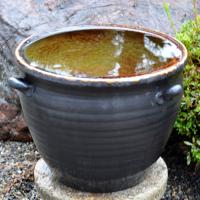 元来、神前、仏前で口をすすぎ、身を清めるための水を確保するための器をさす。庭先に備えた石や岩などをくりぬいた手水鉢のことです。現代では、蹲をそういったことのために設置している所をあまり見掛けなくなりました。現在、蹲は和風庭園を現すためのポイントになっています。また 水連、浮き草、メダカ、金魚などの鉢として使われています。