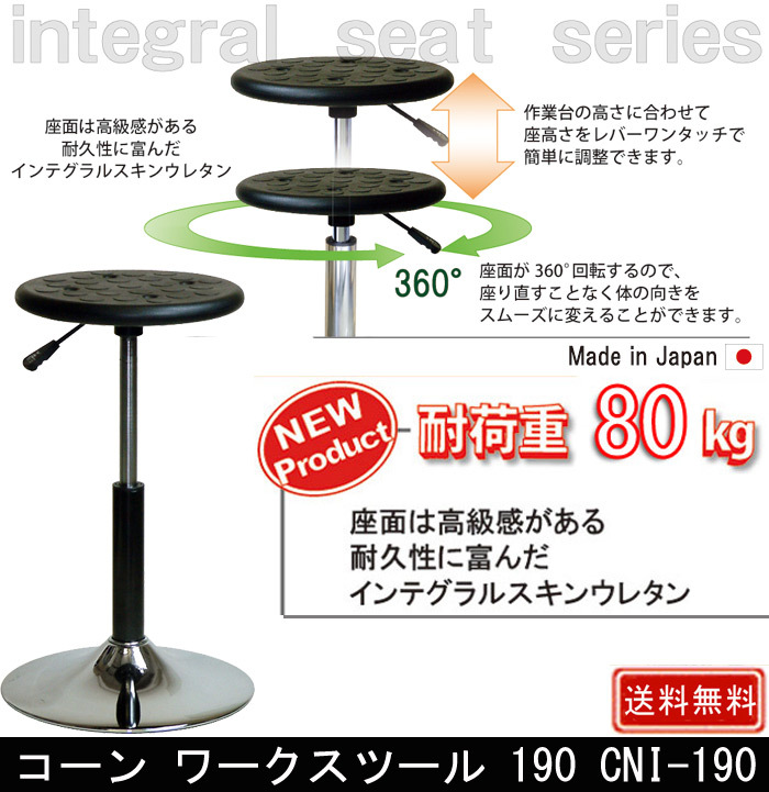 コーン ワークスツール 190 CNI-190 コーン ワークスツール CNI-190 インテグラルスキンウレタン ルネセイコウ スツール 作業用イス オフィス 業務用作業イス ワーキングキャスター コーンワークスツール