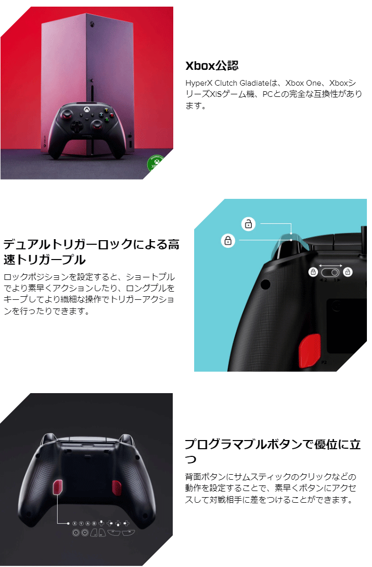 | Xbox公認 HyperX Clutch Gladiate コントローラー デュアルトリガーロック プログラマブルボタン 6L366AA スペック情報 |