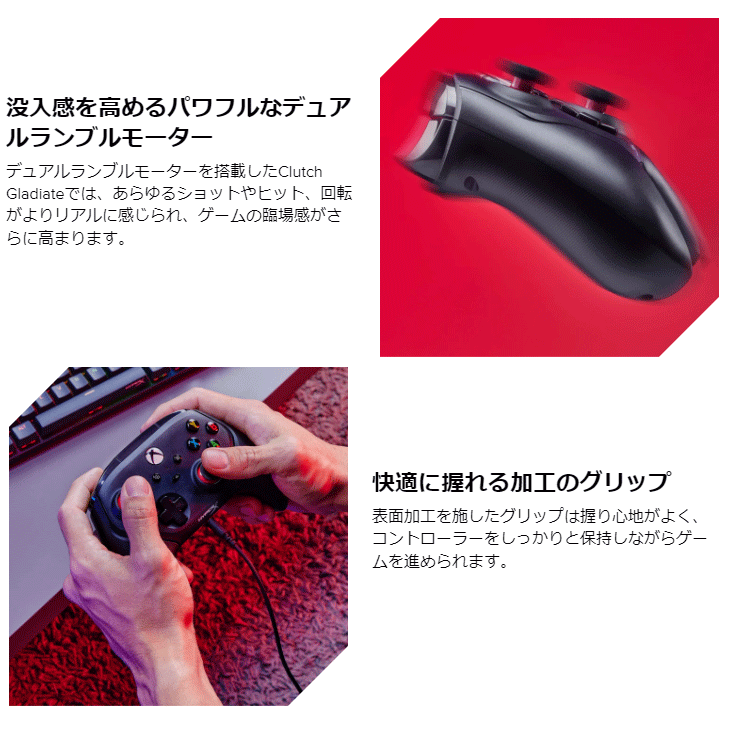 ■ゲームの結果をコントロール。 HyperX Clutch Gladiateは、パフォーマンスを最大限に発揮できるコントローラーを求めるXboxゲーマーのために作られています。Xbox公認の有線タイプコントローラーで、デュアルトリガーロックとマッピングの変更が可能な背面ボタンを備えており、自分のプレイスタイルに合わせてコントロールを最適化することができます。