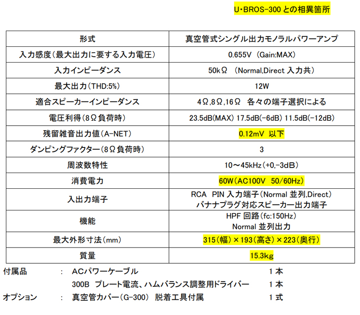 | 【キャンセル不可】U・BROS-300AHPS モノラルパワーアンプ WE300B(PSVANE)付 1台 スペック情報 |