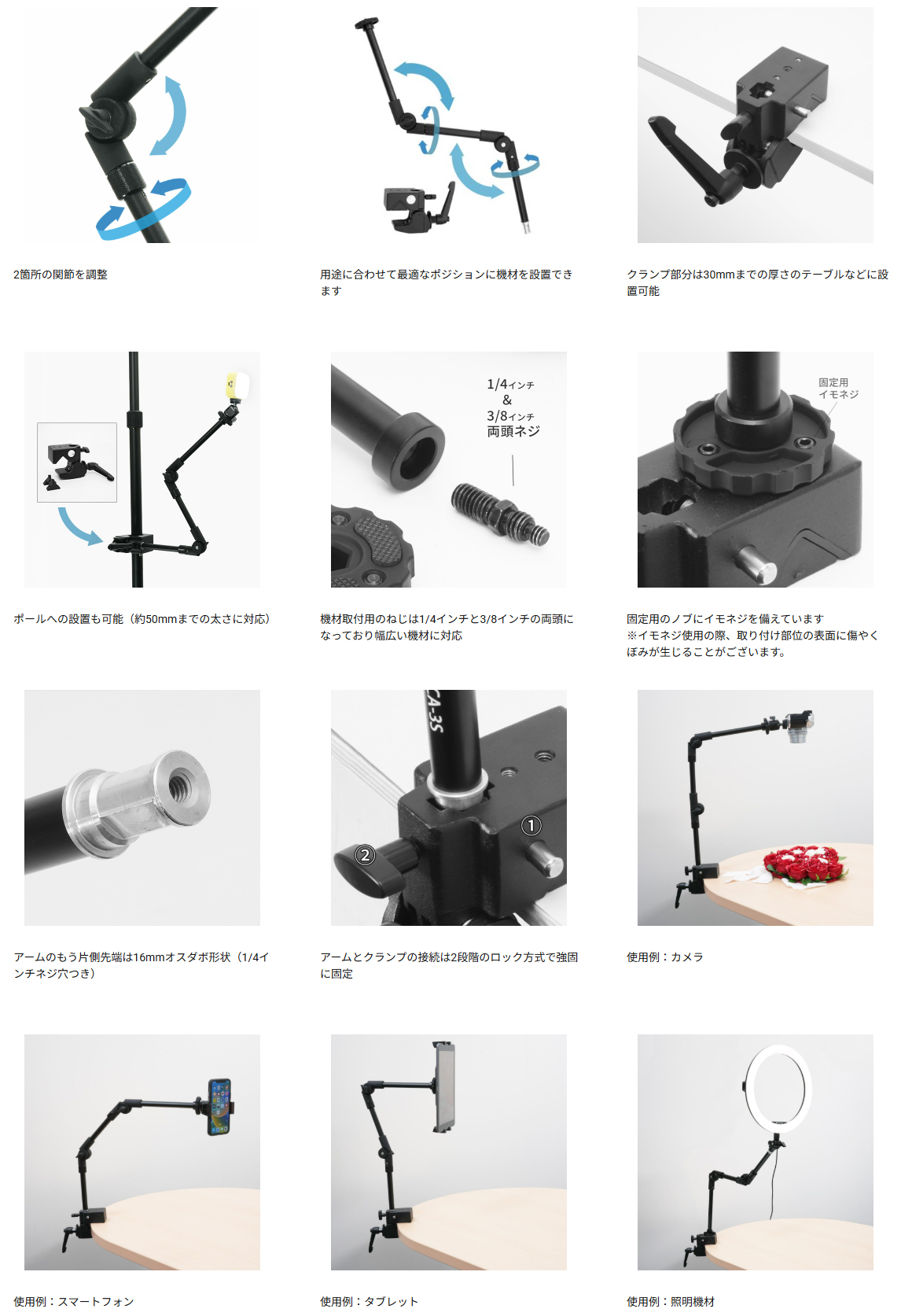 アームの両端に、1/4インチカメラネジとライト取付用ダボを備えており、多様な機材の取り付けが可能、クランプ部分は30mmまでの厚さのテーブルや、50mmまでのポールなどへの取り付けに対応しています。