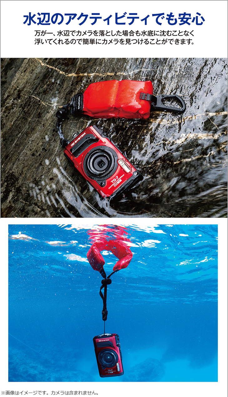 このストラップをカメラに装着しておけば、水中での紛失が防げます。
