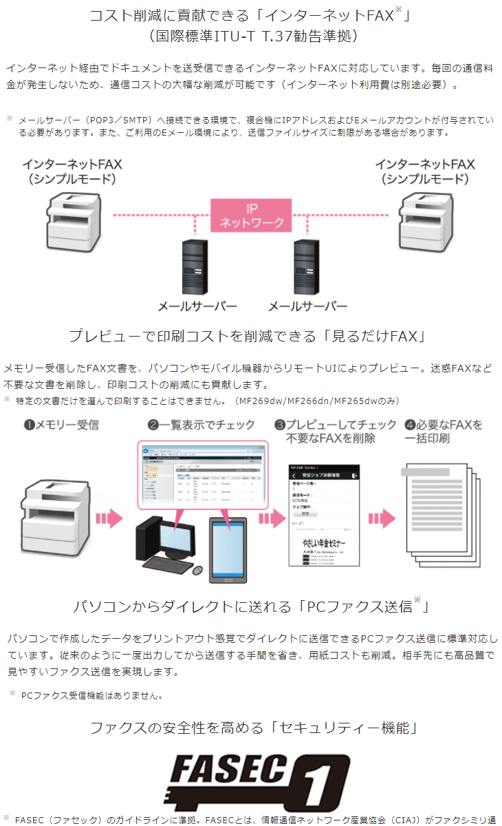 | インターネットFAX機能 | 通信プロトコル:SMTP(送信)/POP3(受信) 通信モード:Simpleモード(ITU-T T.37及びW-NET FAX準拠) 原稿サイズ:A4、B5、A5、A6 対応メールサーバー:Microsoft Exchange Server 2010/2013/2016/2019、Lotus Domino R7.0、Sendmail 8.14.7、Qpopper 4.1.0 |
