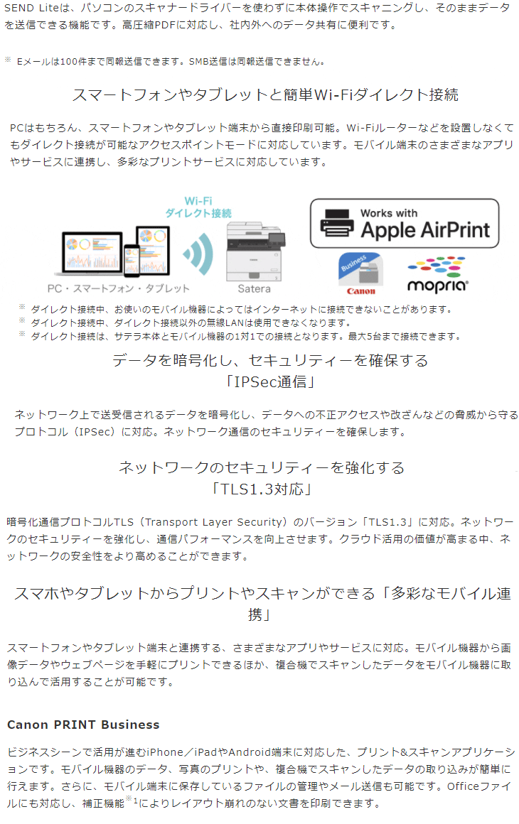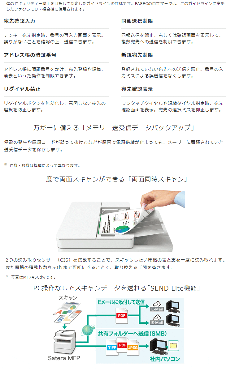 | SEND/SEND Lite機能 | 原稿サイズ:A4、A5、B5 対応プロトコル:SMB(TCP/IP)、FTP(TCP/IP)、SMTP(送信)、POP3(受信) |