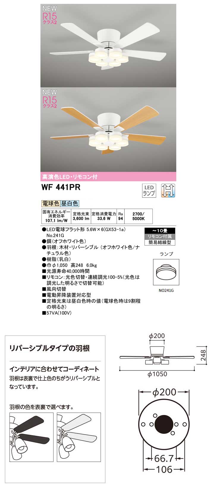 WF441PR シーリングファン 木材リバーシブル(オフホワイト色/ナチュラル色)〜10畳用 スペック情報
