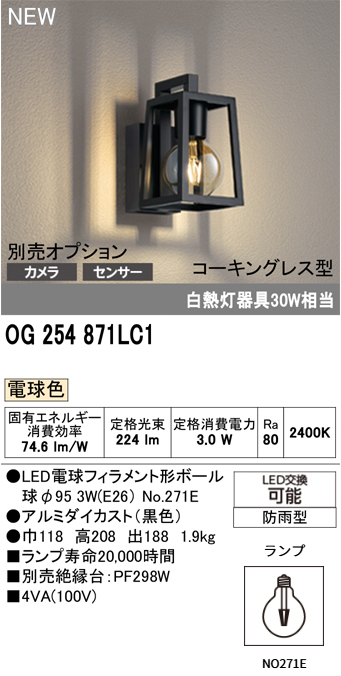 OG254871LC1 LED電球 エクステリア ポーチライト(電球色) コーキングレス型 スペック情報