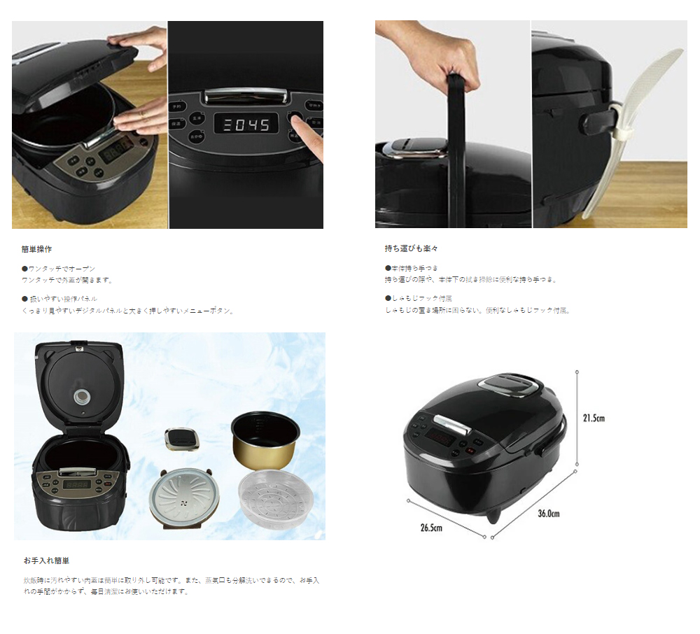 | 梱包内容 | 本体、深型しゃもじ、しゃもじ、しゃもじフック、計量カップ、スチーム皿、内釜、電源コード、取説(保証書) |