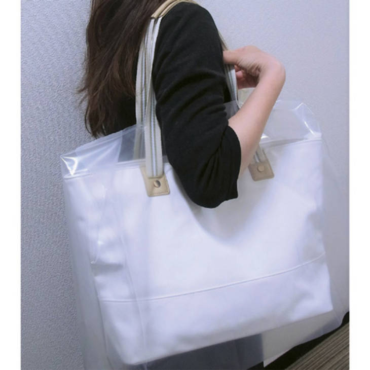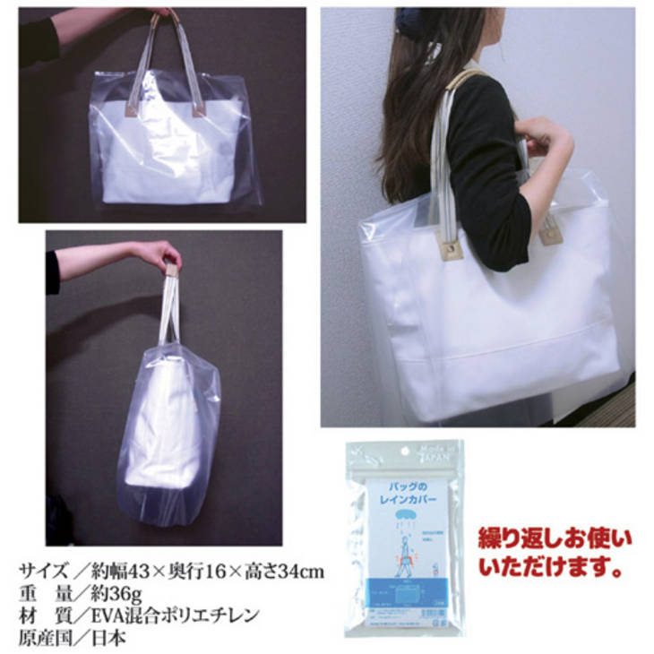 ショルダーバッグにもビジネスバッグにも対応丈夫で繰り返し使え、バッグが見える透明タイプマチ付きで色んなサイズのバッグに使える雨の日に傘をさしていても、手持ちのバッグには雨がどうしてもかかってしまいます。布製のカバンなら中まで水が浸みこんだり、革製のバッグだとシミが付いてしまったりして台無しになってしまいますよね。そんな時に、このカバーをサッとかぶせば雨からカバンを守ることができます。丈夫な透明のカバーで、取手が通せるスリットが付いていて、マチ幅も16センチありますので色んなタイプのカバンにかぶせることができます。高さはバッグに合わせて切ることも可能です。繰り返し使えるタイプです。