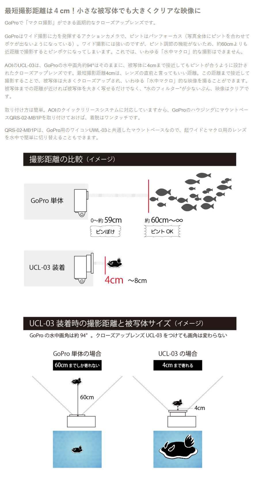 AOIのUCL-03は、GoProの水中画角約94°はそのままに、被写体に4cmまで接近してもピントが合うように設計されたクローズアップレンズです。最短撮影距離4cmは、レンズの直前と言ってもいい距離。この距離まで接近して撮影することで、被写体は大きくクローズアップされ、いわゆる「水中マクロ」的な映像を撮ることができます。