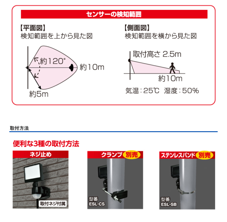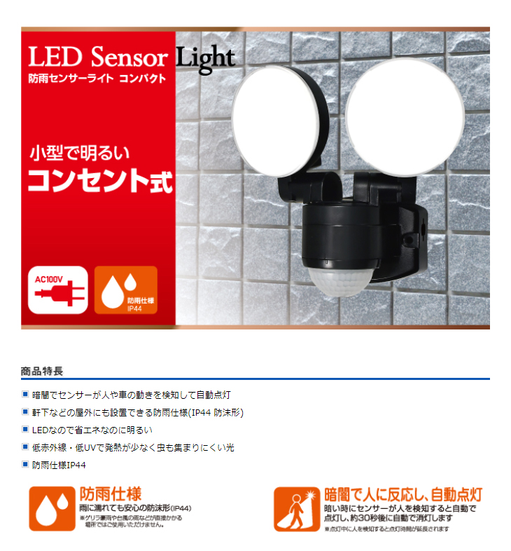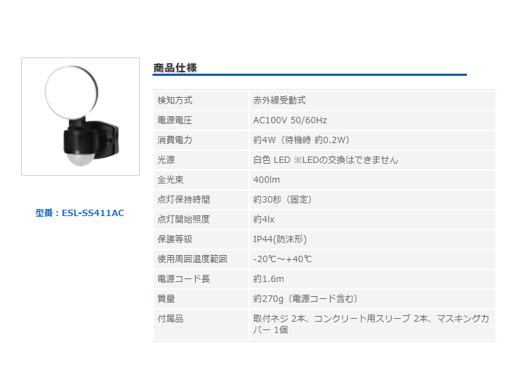 | ESL-SS411AC コンセント式センサーライト 防雨仕様 スペック情報 | |