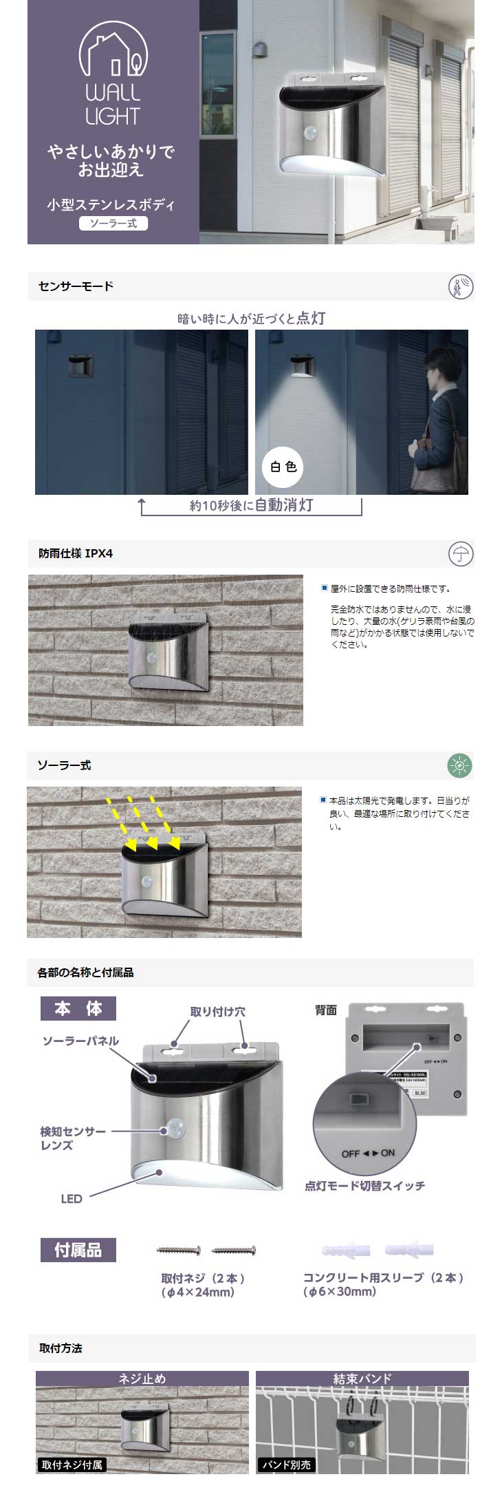 | ESL-KS100SL ソーラー式 LEDセンサーウォールライト 小型ステンレスボディ スペック情報 |