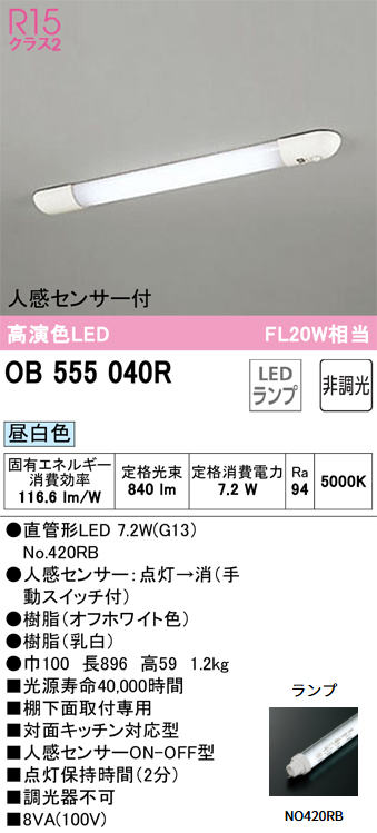 OB555040R キッチンライト 直管形LED(昼白色) 人感センサー付 スペック情報