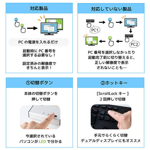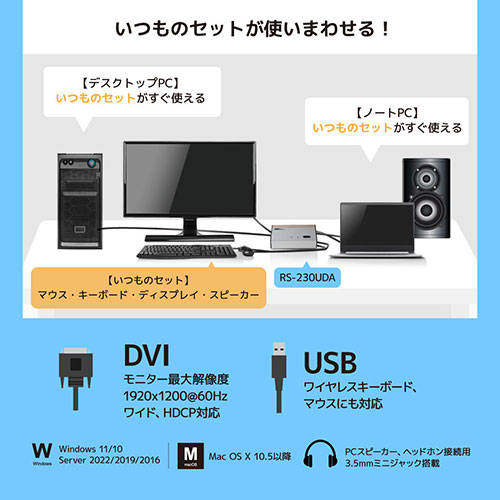 ●1組のキーボード・ディスプレイ・マウスを2台のパソコンで切り替えて快適操作。RS-230UDAを使えば、キーボード・ディスプレイ・マウスを4台のパソコンで切り替えて快適に操作することができます。使い慣れたキーボードとマウスを複数台のパソコンで共有して、作業効率アップ。ディスプレイも複数台そろえる必要がなく、省スペースで経済的です。●ワイドディスプレイ、HDCPにも対応ディスプレイ最大解像度1920×1200@60Hz、フルHD(1920×1080)対応。HDCPにも対応し、本製品経由でもBlu-rayディスクの映画を高解像度で楽しめます。●電源を入れるだけのシンプル起動、解像度も最適表示本製品はPC起動時、切替器でPC番号を選択する必要がありません。選択していないPCも、設定済みの解像度できちんと表示されるようになっています。●切替は本体ボタン、ホットキーの二通りに対応本体ボタンを1回、またはキーボード上の[Scroll Lock]キーを2回押すだけのシンプル操作で、簡単にパソコンを切り替えることが可能です。●さまざまな機能をもつUSBマウス、キーボードに対応USBドングル接続タイプのワイヤレスキーボードやマウス、デスクトップセットも使用可能。※Bluetooth接続のキーボード/マウスは対応していません。●PC用スピーカー、ヘッドホンが接続できる、3.5mmミニジャック搭載PC用スピーカー、ヘッドホンが接続可能なので、会議室でのリモート会議や、自宅でのテレワーク、夜間帯でのゲーム等、シーンや用途に合わせて使い分けることができます。●ACアダプター添付本製品にはACアダプターを添付。外部電源を供給することで、安定した伝送が可能です。●マウス・キーボードのみの接続も可能本製品は、ディスプレイを接続せずに、マウス・キーボードのみの接続が可能。それぞれのパソコンにディスプレイを接続したい場合に便利です。●場所を取らないコンパクト設計大きさ約107×70×25のコンパクト設計。アルミ筐体+コネクタによる小型化で、デスクにすっきり安定設置。