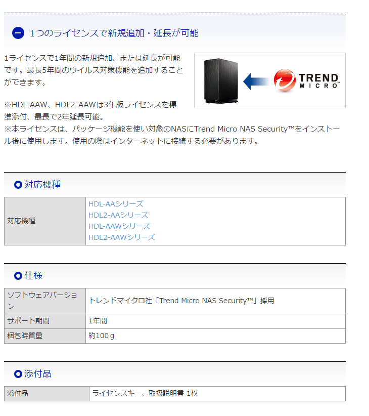 本商品は法人向けNAS(HDL-AA、HDL2-AA、HDL-AAW、HDL2-AAW)専用のウイルス対策機能ライセンスです。