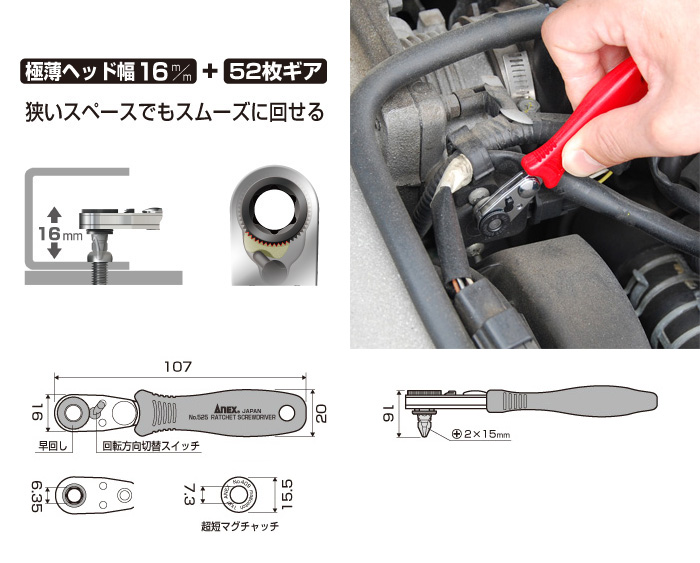 | 【ANEX】コンパクトビット・ラチェット52ストレート型 超短マグキャッチ付 525-M スペック情報 |