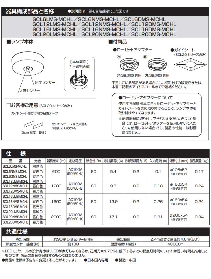 | SCL12DMS-MCHL LED小型シーリング 1200lm 昼光色 人感センサー付 スペック情報 |