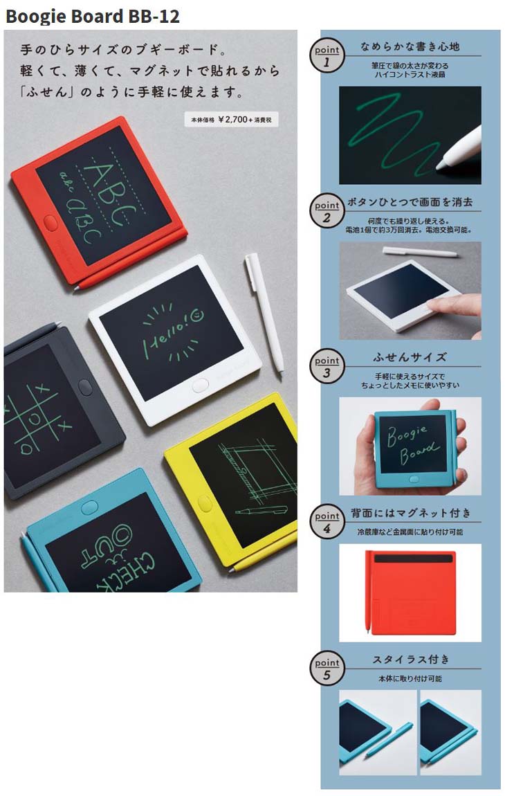 「ブギーボード」シリーズの中で最もコンパクトなサイズです。薄くて軽いため、ふせんやブロックメモ感覚で使用できます。