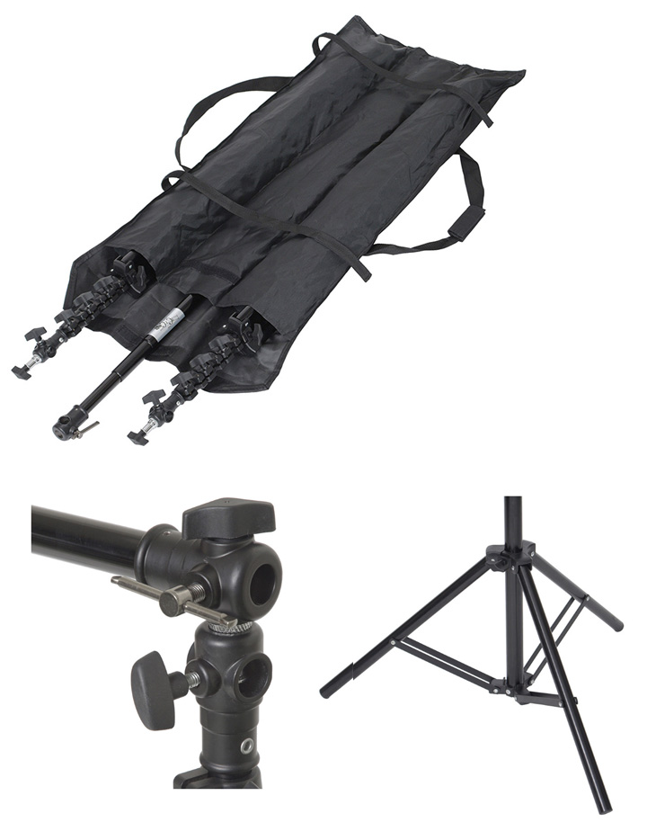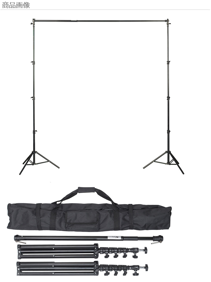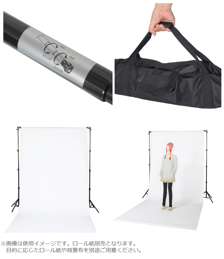 スタンド部はエアクッション付きで最大高は2.2m。背景紙サポート用のバーは背景紙の幅に合わせて素早く長さを決定できる3段の伸縮式で、最大1.8m幅まで対応。キャリングケースも付属しています。目的に応じたロール紙や背景布を別途ご用意ください。