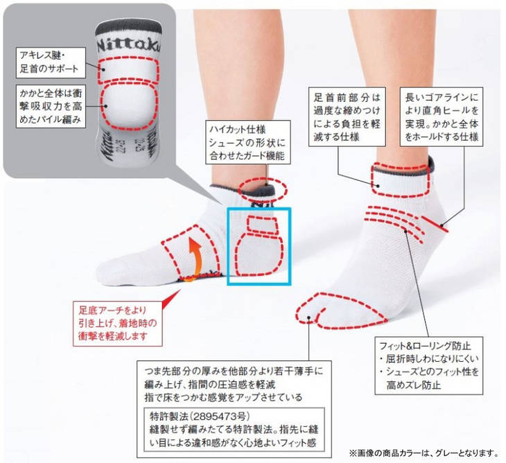 | 機能 | 吸水速乾、抗菌防臭、アキレスガード(アキレス腱を保護する機能です) |
