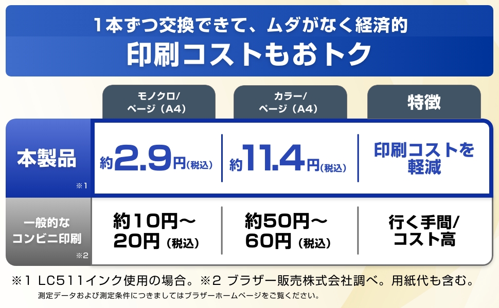 | インク構成 | 4色独立、ブラック:顔料 / カラー:染料(LC511シリーズ) |