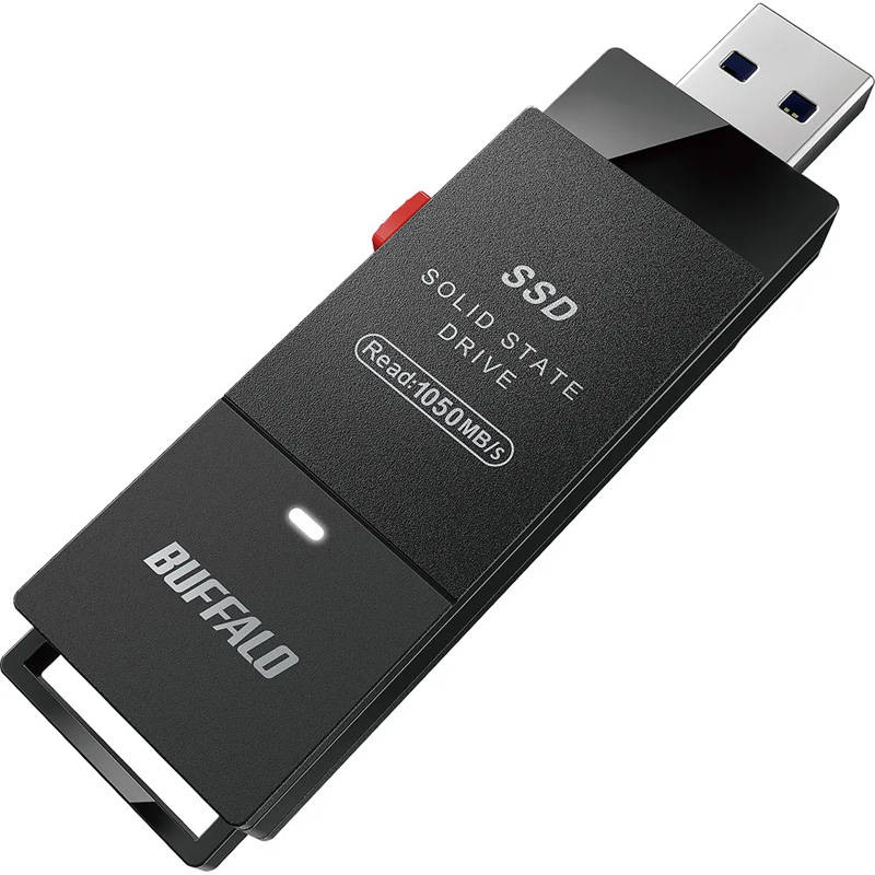 SSDとUSB3.2(Gen2)対応により、「読み込み:約1050MB/s 以上」「書き込み:約900MB/s以上」の高速なデータ転送を実現。容量の大きな動画や画像ファイルをたくさんやり取りする際にも、快適にお使いいただけます。また、本商品にはType-C変換アダプターが付属。USB Type-A端子が搭載されていない薄型のノートパソコンでもお使いいただけます。