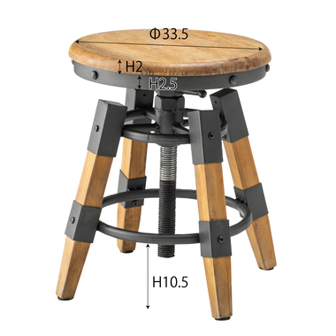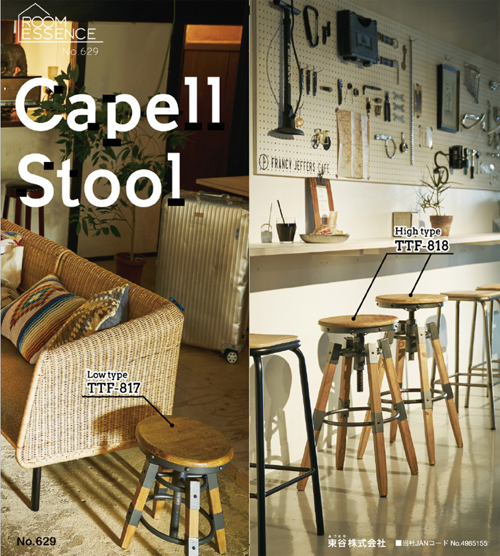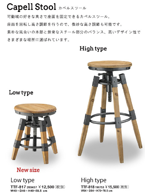 可動域の好きな高さで座面を固定できるカペルスツール。座面を回転し高さ調節を行うので、微妙な高さ調節も可能です。素朴な風合いの木部と無骨なスチール部分のバランス、高いデザイン性でさまざまな場所に選ばれています。