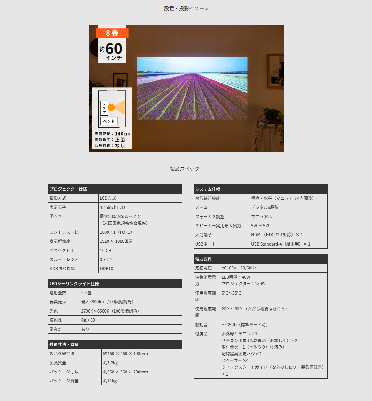 | 定格消費電力 | LED照明:40W、プロジェクター:180W |