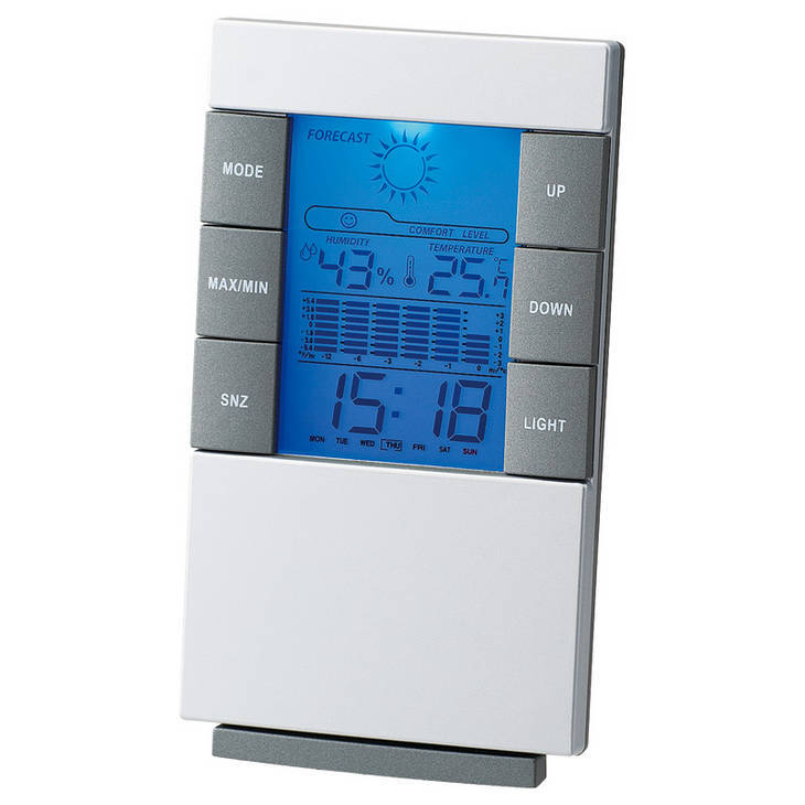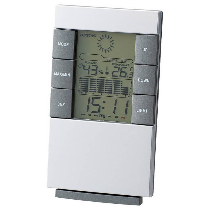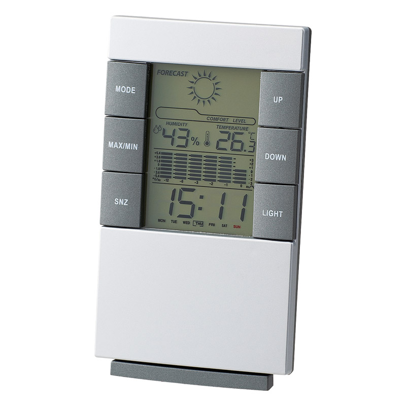 時計、アラーム、スヌーズ、温度計、湿度計、カレンダー、バックライト。