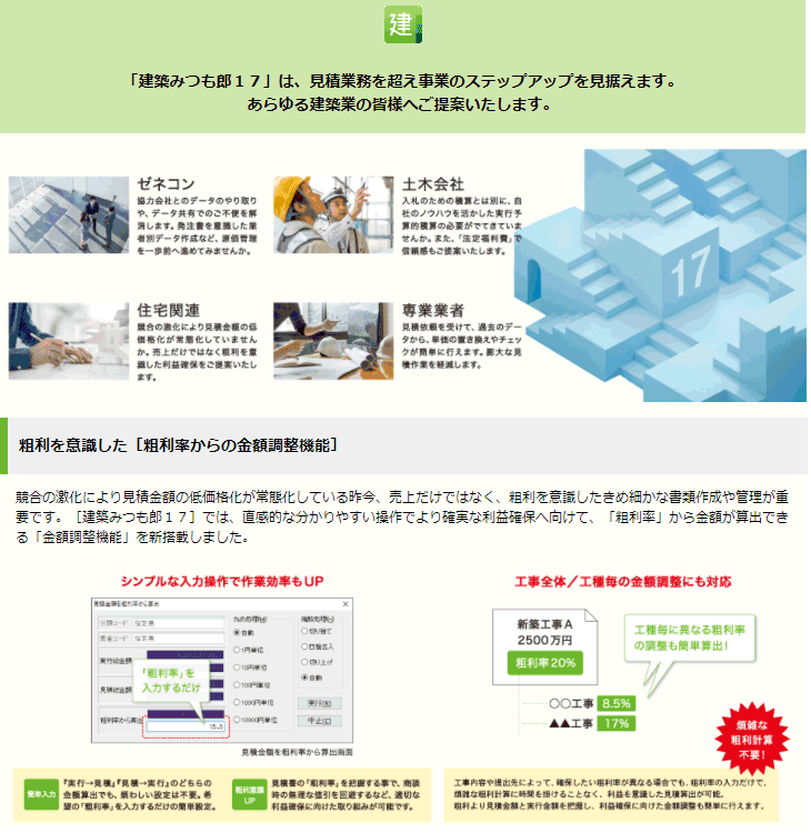 ケンチクミツモロウ17 積算見積プロセッサの決定版。更なる操作性の向上と商機をつかむ管理術で、工事見積提出の効率化と成約率に繋げる機能を搭載