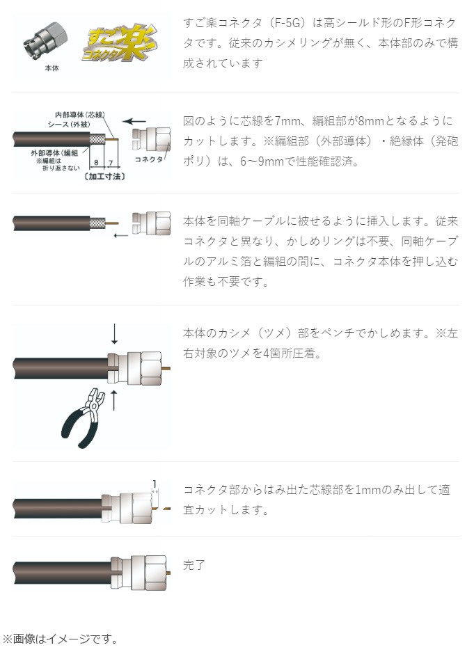 同軸ケーブルを規定寸法にカット・剥離し、コネクタ本体をかぶせて、ペンチでかしめるだけ! 従来のF形コネクタのように、コネクタ本体を同軸ケーブルのアルミ箔と編組の間に差し込む作業も不要、編組の折り返しも不要です。煩わしい かしめリングの挿入・入れ忘れも発生せず、簡単・安全に作業ができます。