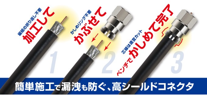 ■高シールドで電波漏洩をしっかりと防止コネクタ本体がしっかりとアルミ箔・編組を押さえ、従来F形コネクタよりも高いシールド性を実現、電波漏洩をしっかりと防止します。