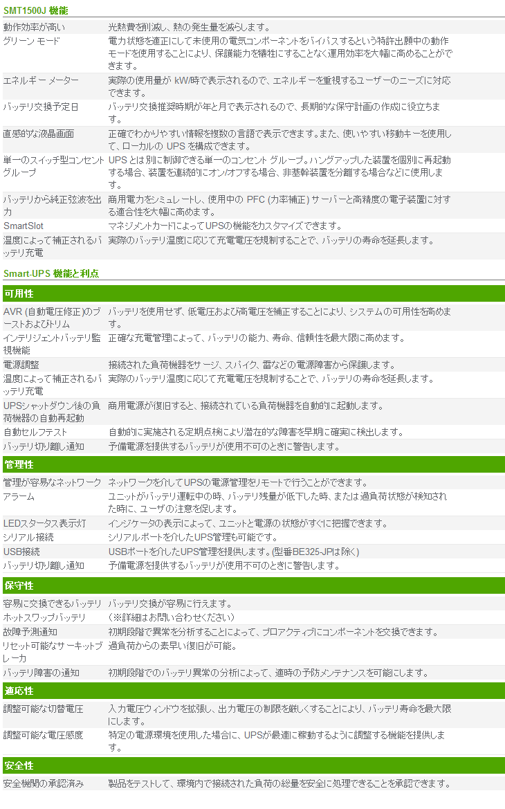 | APC 無停電電源装置 UPS SMT1500J E ラインインタラクティブ給電 正弦波 1500VA/980W 1年保証 スペック情報 |