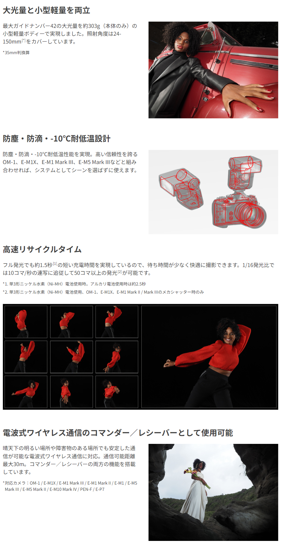 ■大光量と小型軽量を両立 最大ガイドナンバー42の大光量を約303g(本体のみ)の小型軽量ボディーで実現しました。照射角度は24-150mm[*]をカバーしています。