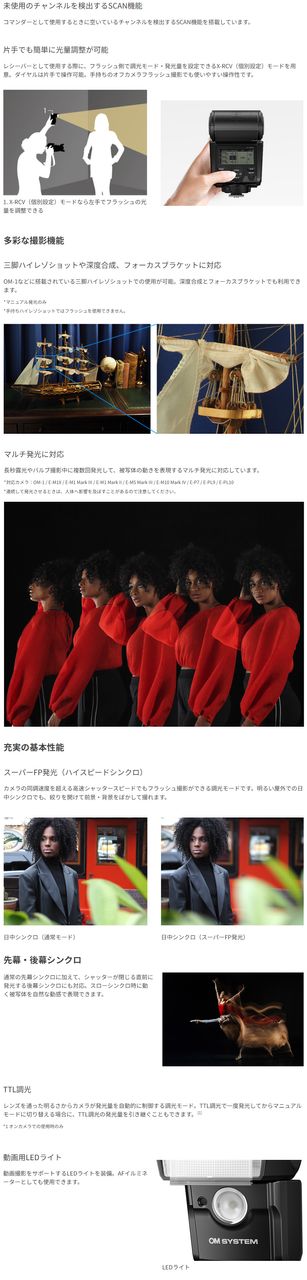 ・通常の先幕シンクロに加えて、シャッターが閉じる直前に発光する後幕シンクロにも対応。