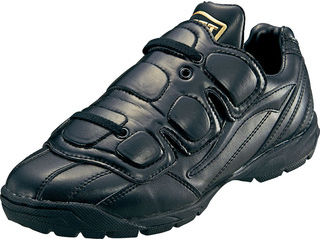 主審・塁審兼用のアンパイアシューズ。足甲部の保護パーツがヒモ式脱着仕様なので、簡単に取り外せるモデルです。
