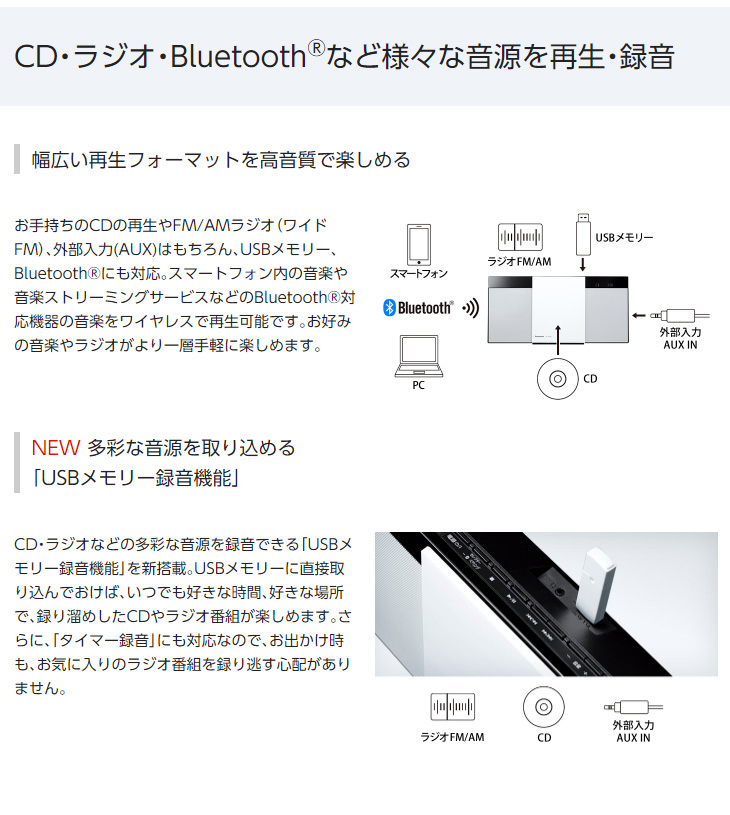 ■幅広い再生フォーマットを高音質で楽しめるお手持ちのCDの再生やFM/AMラジオ(ワイドFM)、外部入力(AUX)、USBメモリー、Bluetooth®にも対応。スマートフォン内の音楽や音楽ストリーミングサービスなどのBluetooth®対応機器の音楽をワイヤレスで再生可能です。