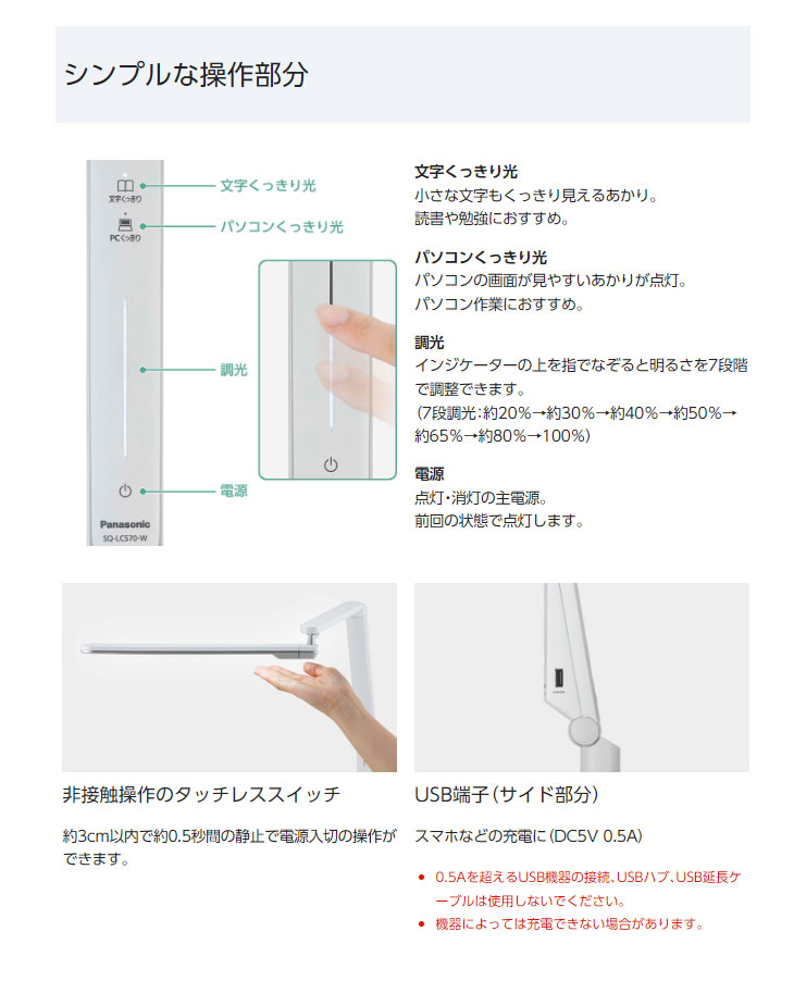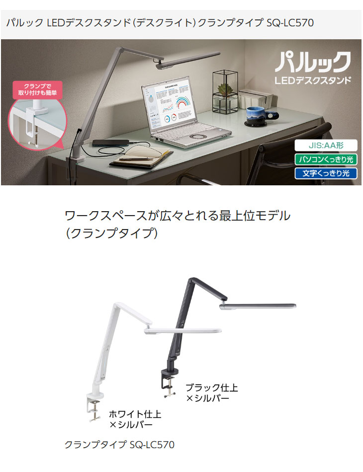| SQ-LC570-W(ホワイト仕上×シルバー) LEDデスクスタンド【クランプタイプ】 スペック情報 | |