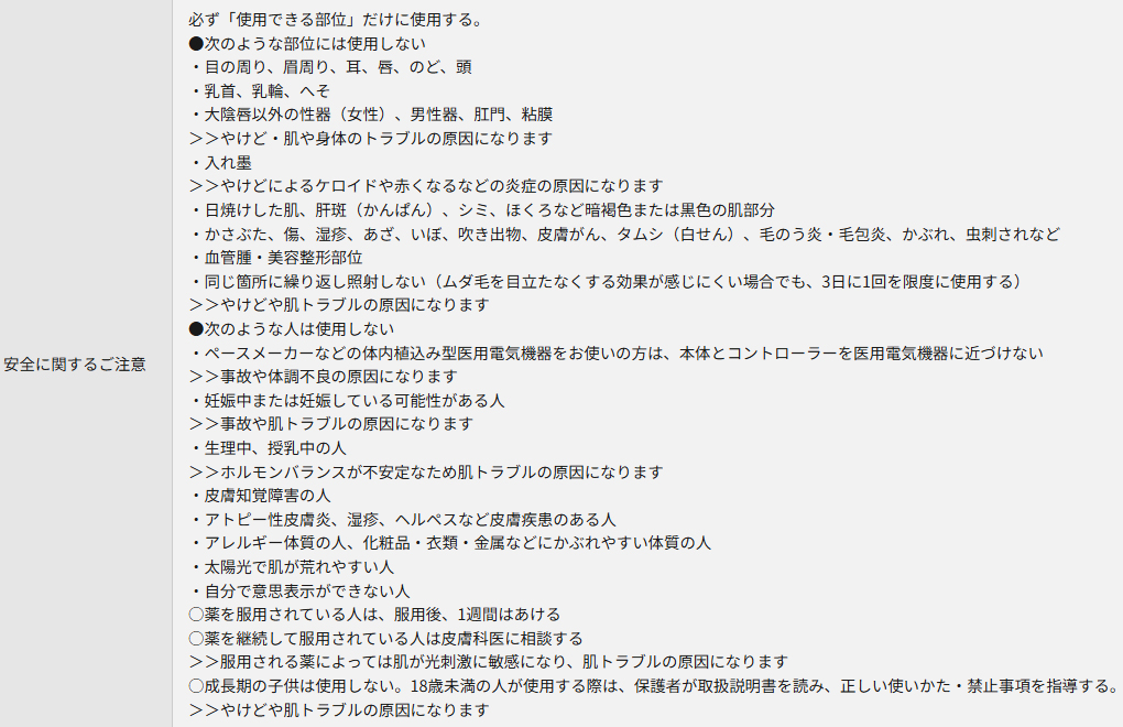 | 使用できる部位 | 脚、腕、ワキ、手、胸、お腹、Vゾーン、Iゾーン、Oゾーン、顔(ヒゲ含む) |