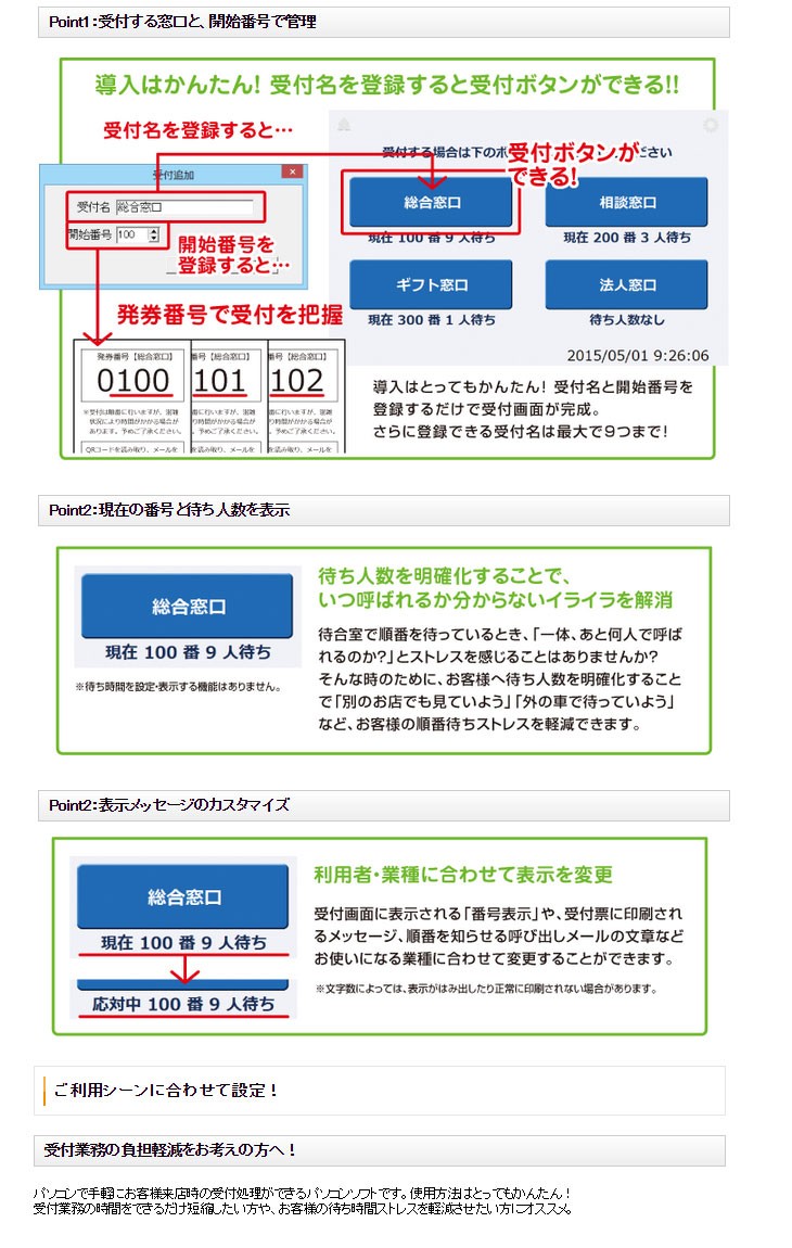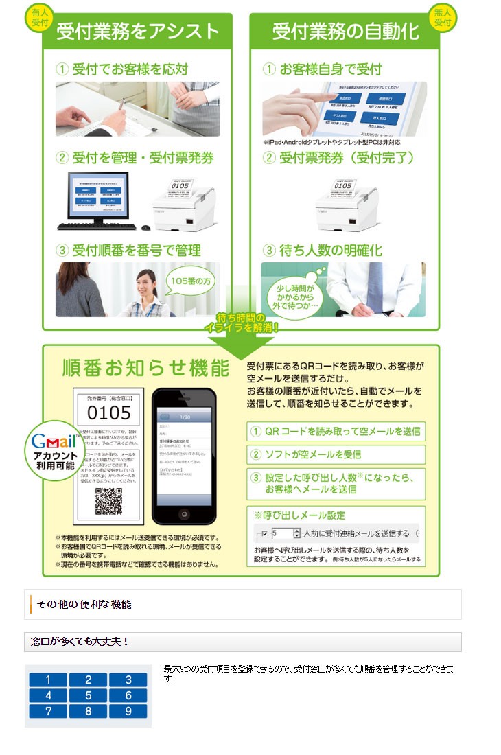 受付業務の負担を軽減!パソコンで手軽に受付処理、レシートプリンターで発券ができる!!順番お知らせ機能でお客様にも便利!