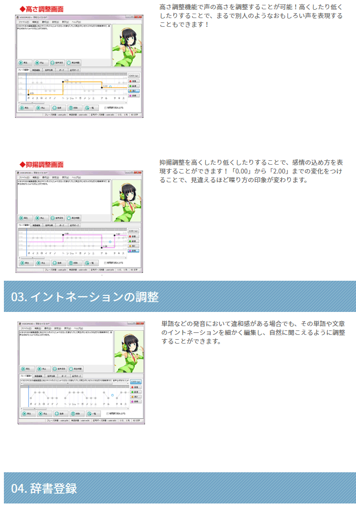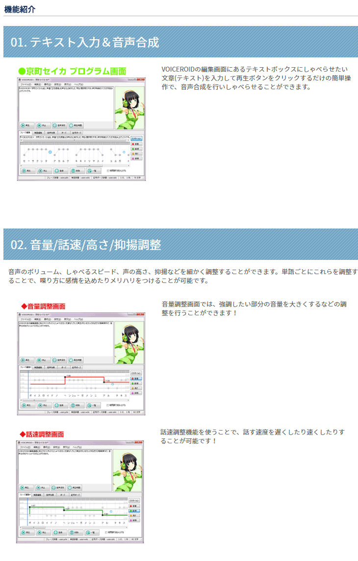 「VOICEROID+ 京町セイカ EX」は、明るく聞き取りやすい声が特徴の入力文字読み上げソフトです。あなたのお好みの文章や言葉をテキストで入力するだけで、簡単に読み上げさせることができます。フレーズごとの話速/抑揚などの細かな調整を行うことができます。