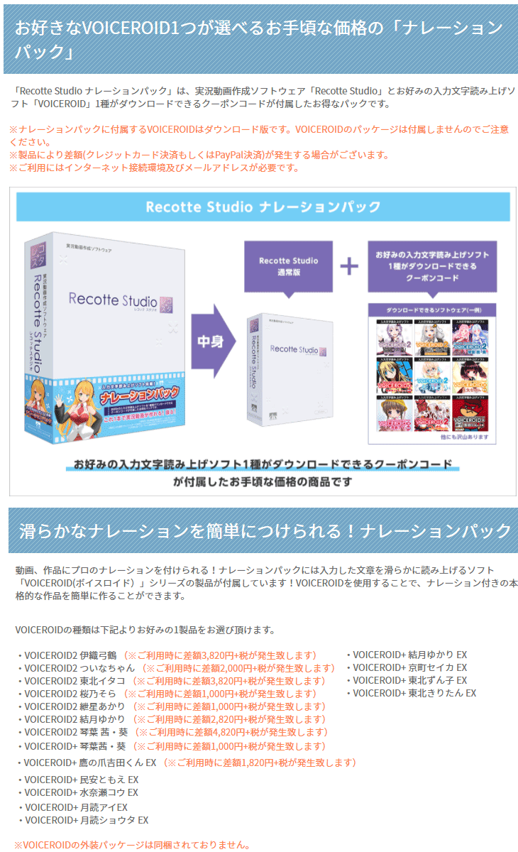 「Recotte Studio」は、手軽でありながら本格的な実況動画作成を行うことができる実況動画作成ソフトウェアです。今まで時間のかかったテロップ挿入作業、立ち絵の挿入など、実況動画によくある動画編集作業があっという間に行えます。「Recotte Studio ナレーションパック」は、お好みの入力文字読み上げソフトを1種類ダウンロードできるクーポンコードが付属したお得なパックです。