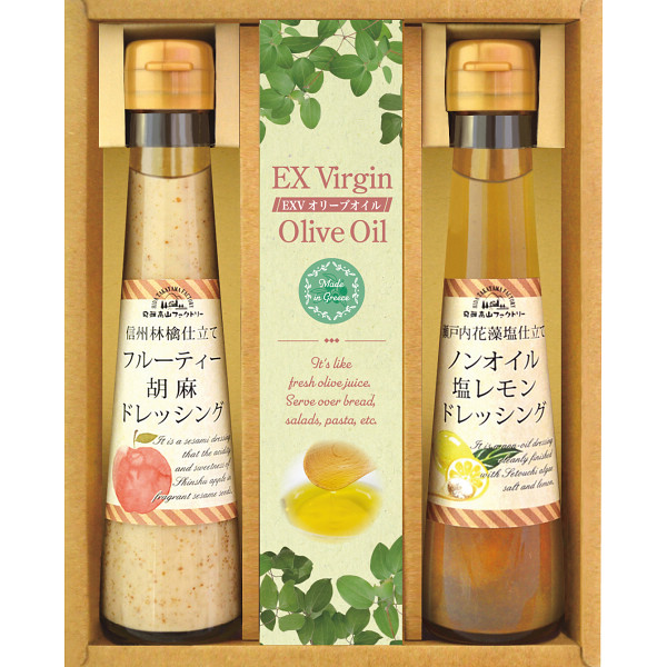 ●ドレッシング(信州林檎仕立てフルーティー胡麻)120ml×1、ドレッシングタイプ調味料(瀬戸内花藻塩仕立てノンオイル塩レモン)120ml×1、エクストラバージンオリーブオイル8g×5