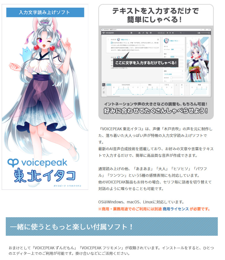 SAHS50000 「VOICEPEAK 東北イタコ」は、声優「木戸衣吹」の声を元に制作した、落ち着いた大人っぽい声が特徴の入力文字読み上げソフトです。