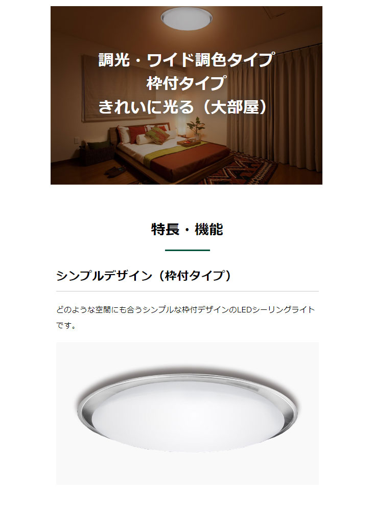 調光・ワイド調色タイプ・枠付タイプ きれいに光る(大部屋) ●どのような空間にも合うシンプルな枠付デザインのLEDシーリングライトです。