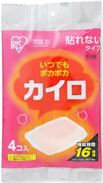 レギュラーサイズの貼れないタイプのカイロ、4個入りです。
