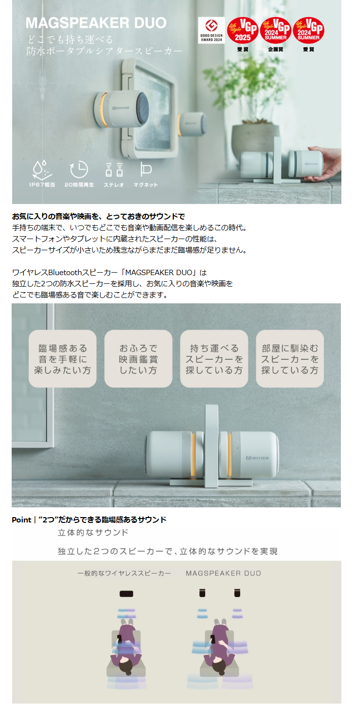 | 9YYA30RH08「MAGSPEAKER DUO」マグネット付 防水ポータブルステレオスピーカー Bluetooth対応 ホワイト スペック情報 |